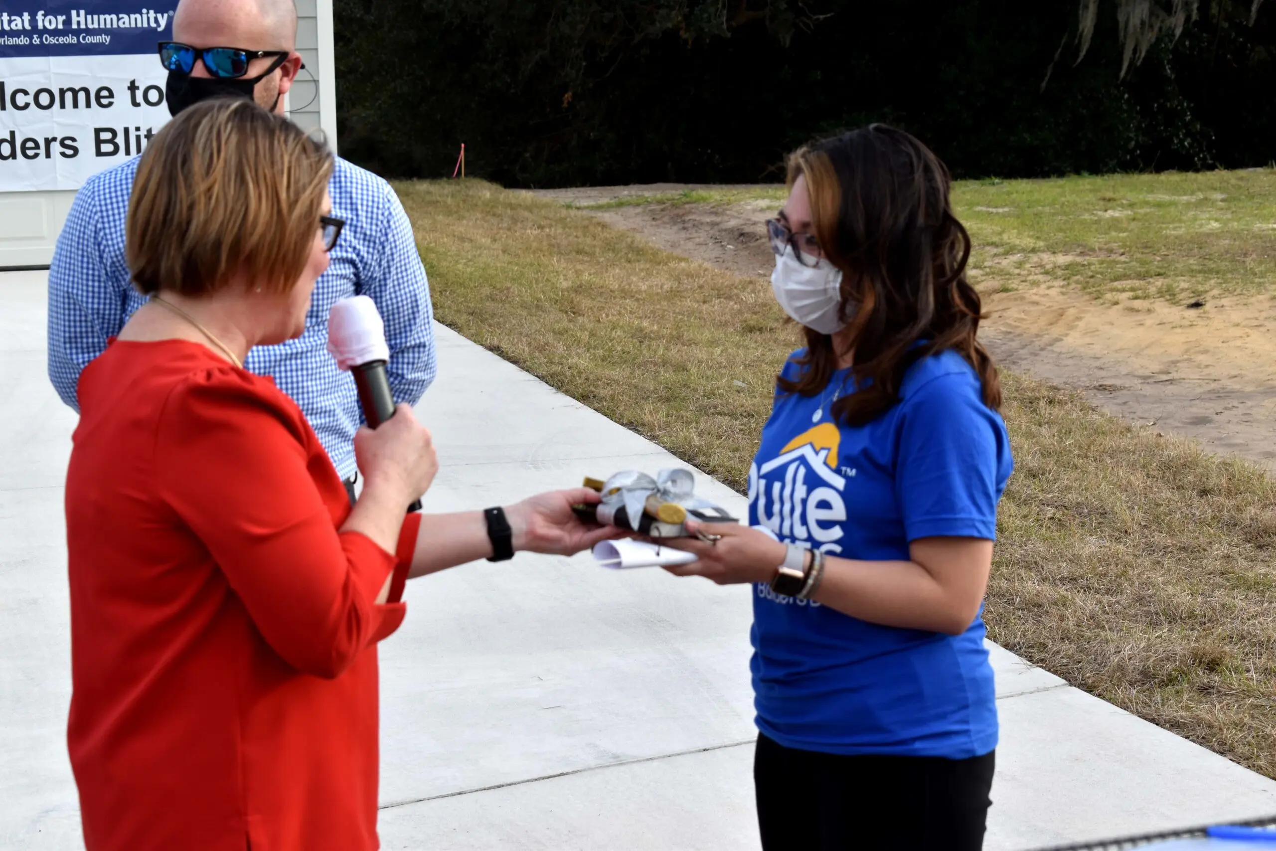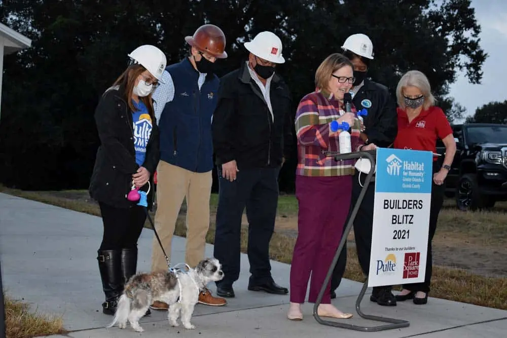 7 a.m. on Day 1: Catherine Steck McManus, president and CEO of Habitat for Humanity Greater Orlando & Osceola, speaks at the opening ceremony with builders Pulte Homes and Park Square Homes and future homeowners Hannah and Minunga.