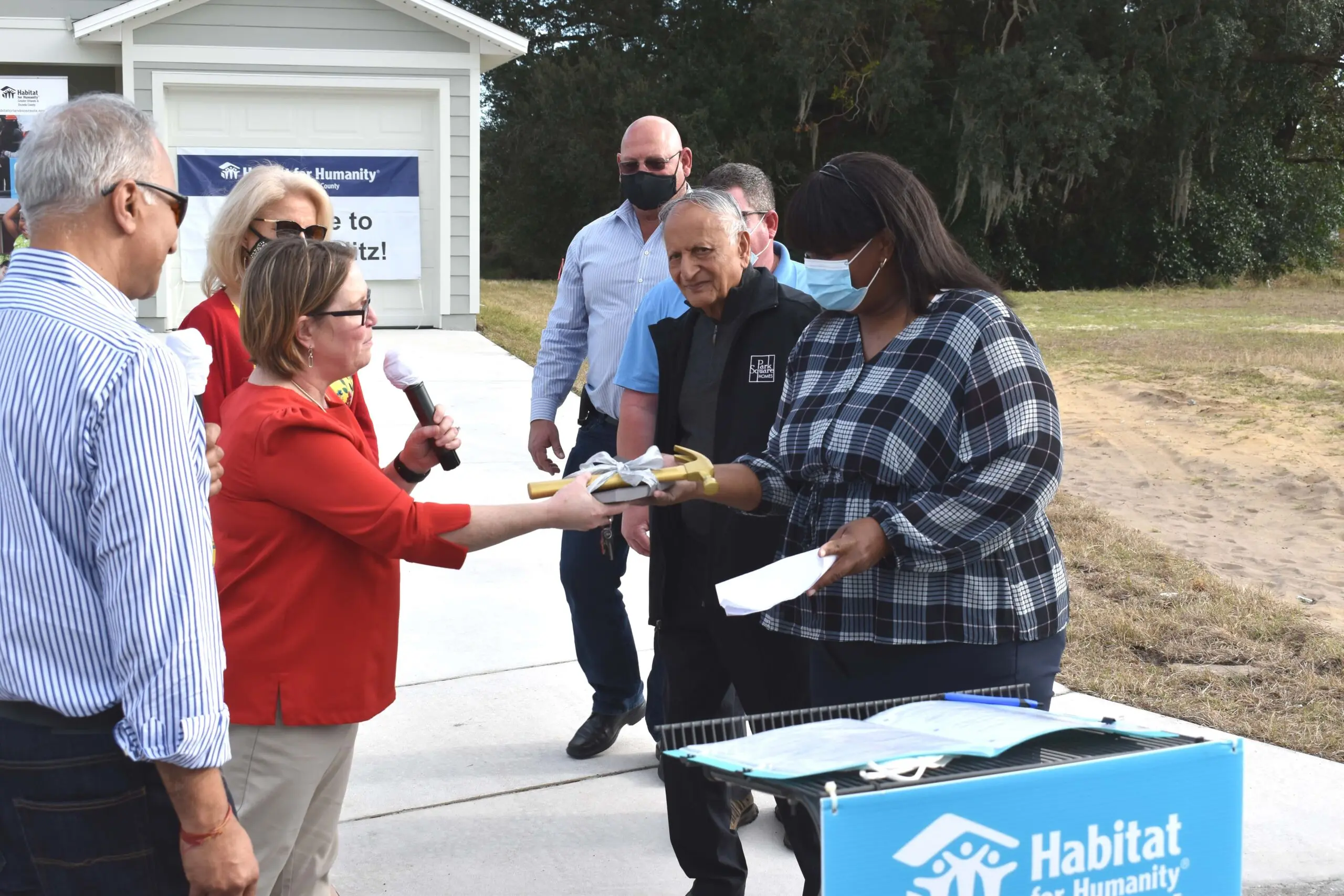 Key Ceremony: Habitat CEO Catherine McManus hands future homeowner Minunga a bible and a gold hammer.