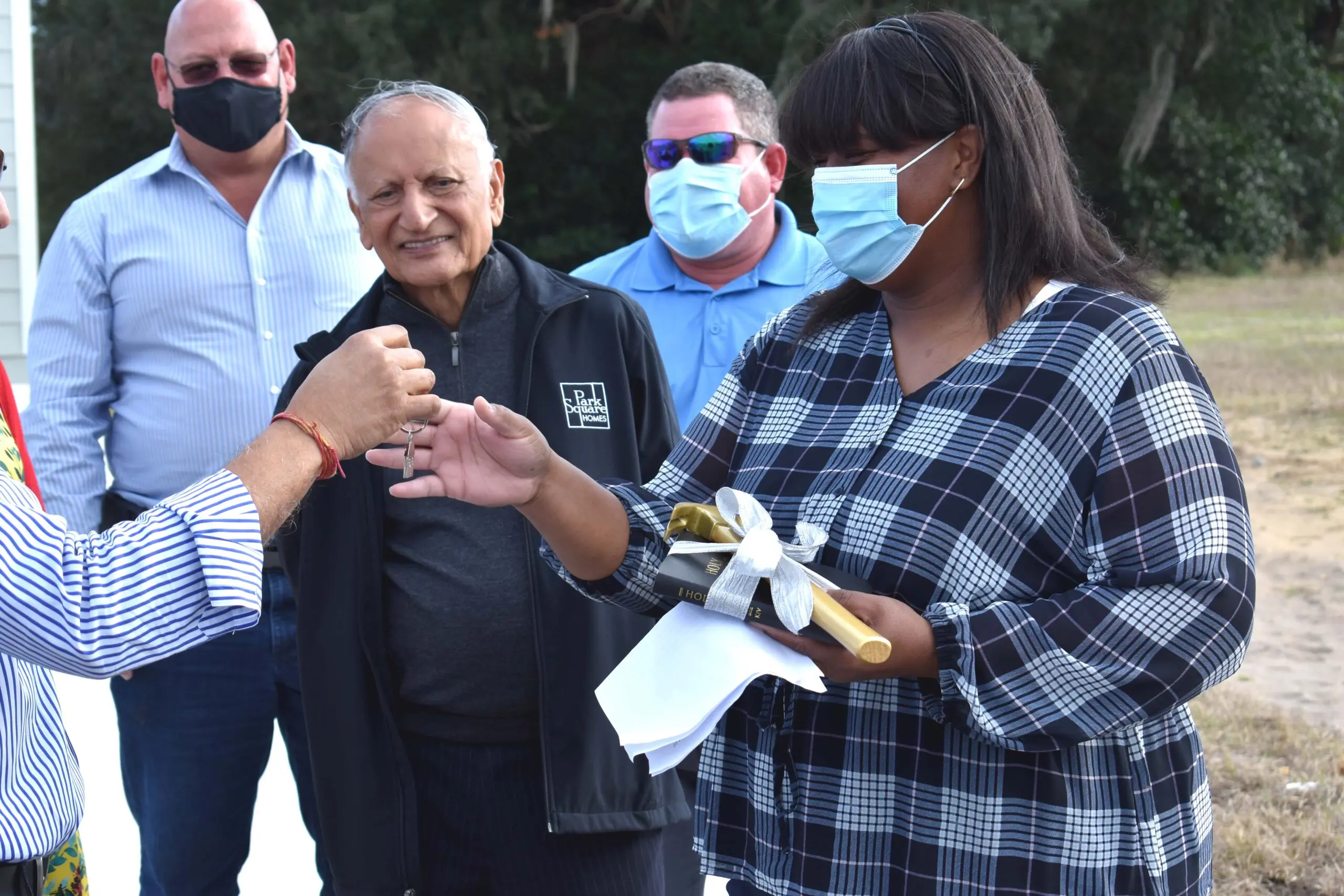 Key Ceremony: Future homeowner Minunga receives her house keys from Park Square Homes’ CEO Suresh Gupta.
