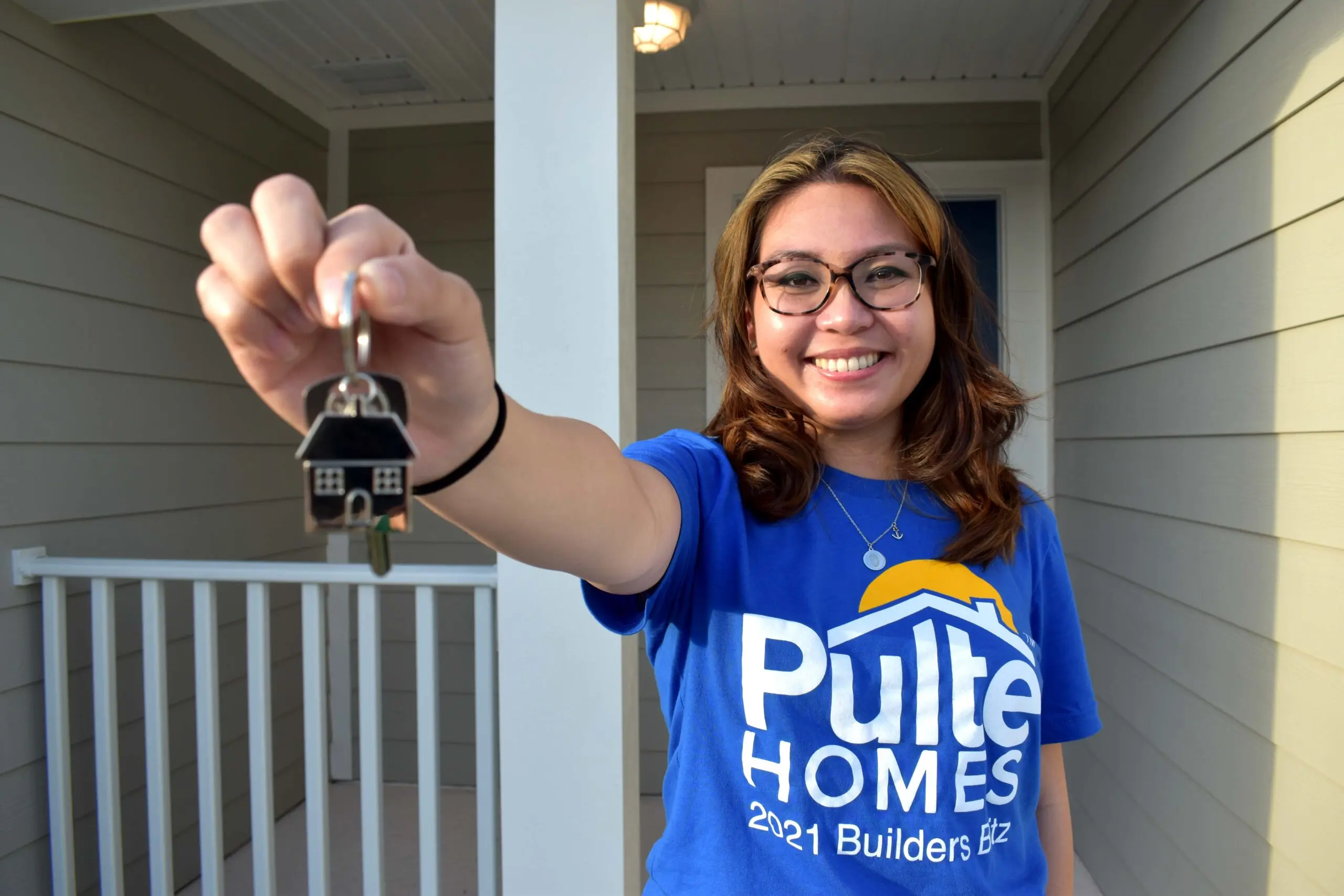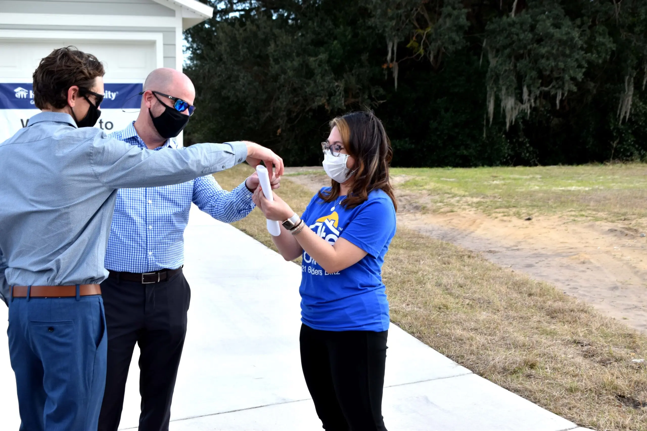 Key Ceremony: Pulte Homes’ Jonathan Pierce and Ian Hewett give future homeowner Hannah her house key.