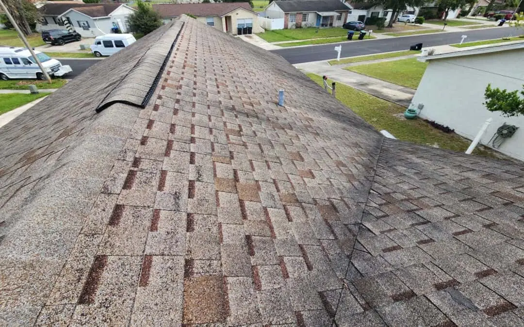 2. Blistered, curled, or split shingles need to be secured or replaced, along with any loose or missing shingles. Also look for dark patches on the roof that may indicate the protective granular coating has worn away from those shingles.